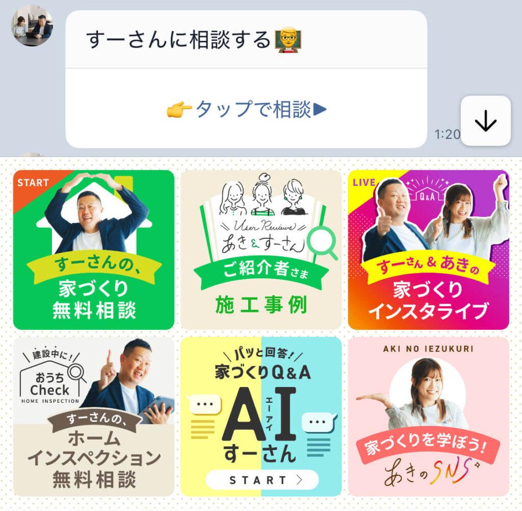 アンケートフォームが見当たらない場合は、LINE下のメニューを開いて「すーさんの家づくり無料相談」をタップしてください!