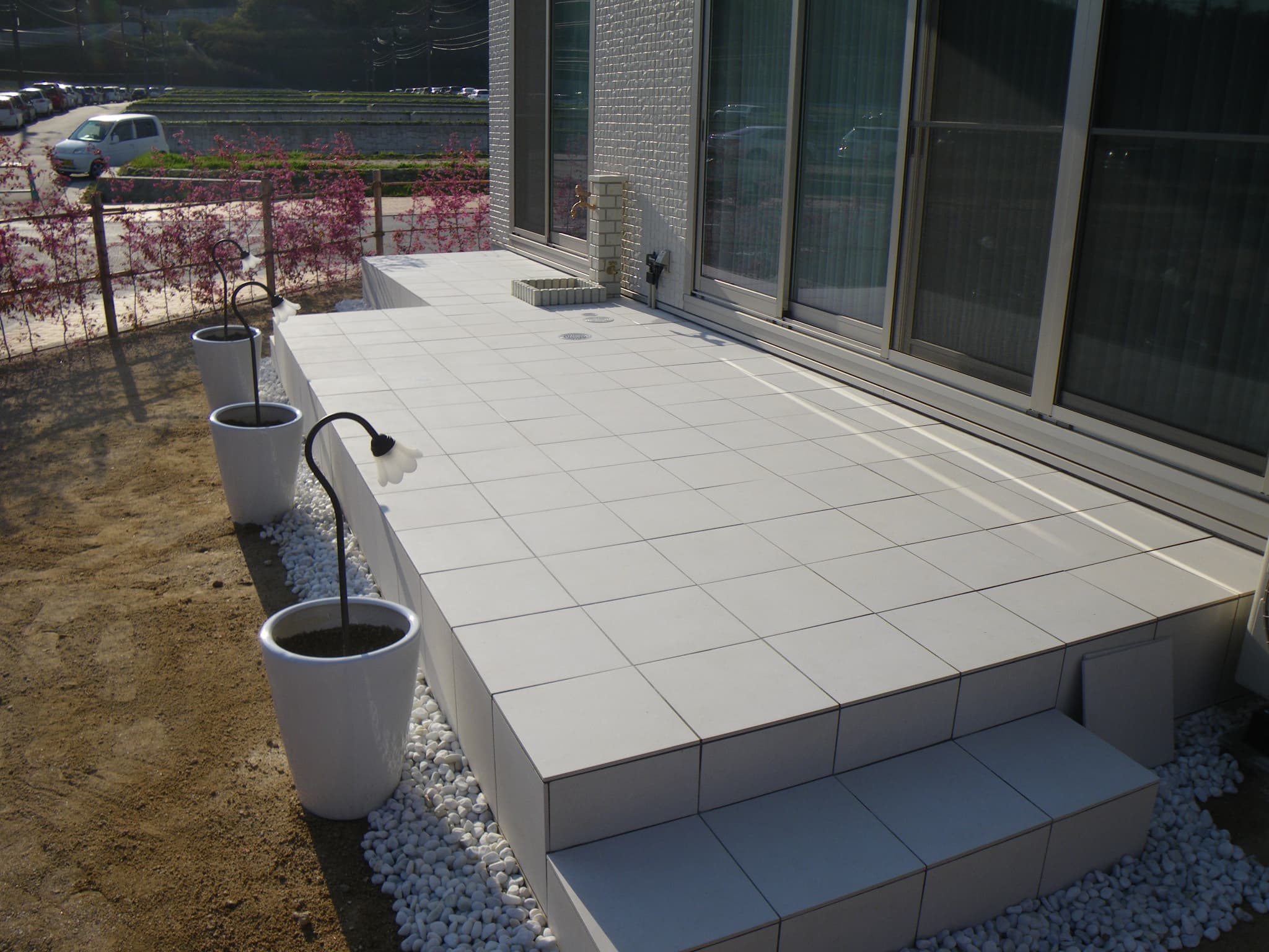 テラスをタイル仕上げにすると、耐久性が非常に高く、泥汚れなども水で洗い流すだけで簡単に落ちるため、長期間きれいな状態を保つことができます。